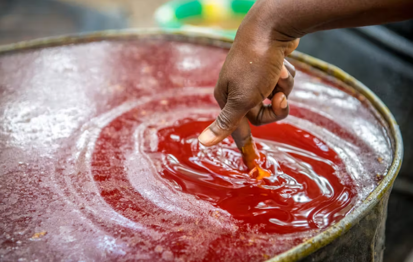 Rich, red palm oil bottled fresh, a staple ingredient in traditional cooking and natural products.